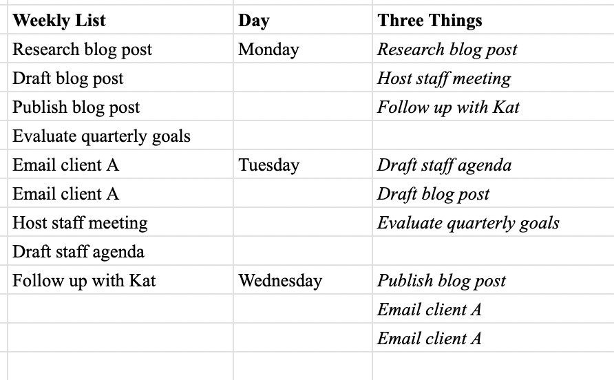 Once you’ve done those three things, you’re free to work on other tasks. But doing those three things first is a productive way to approach an otherwise overwhelming list. Here’s an example of how this would work: